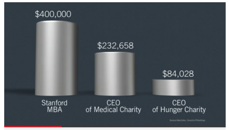 He then uses the chart below (the Stanford MBA figure is the median salary for someone ten years out of business school and the CEO figures are averages) to argue, “There’s no way you’ll get people with $400,000 talent to make a $316,000 sacrifice every year to become the CEO of a hunger charity.”