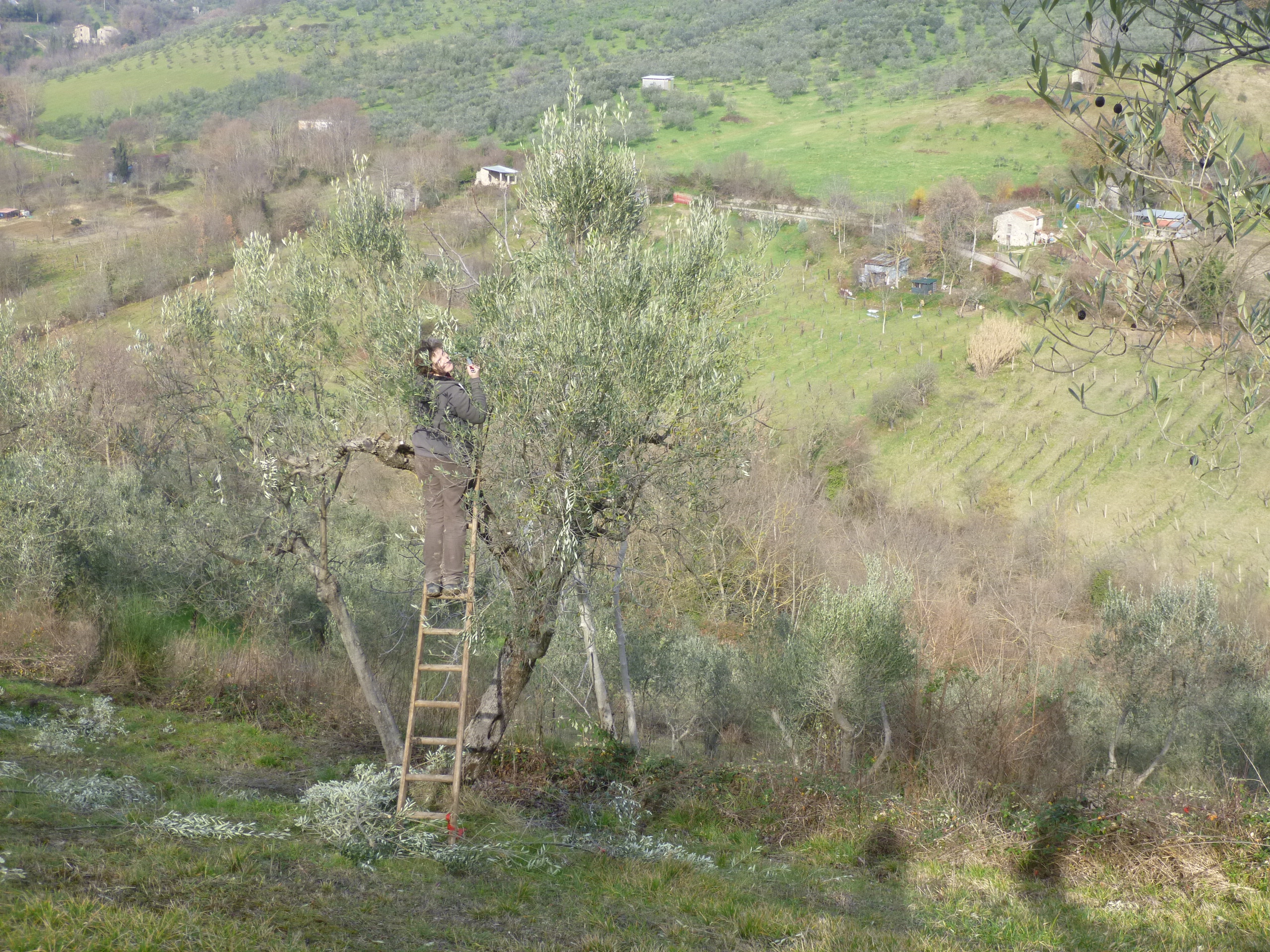 Pruning, the strategy of removing and shaping branches to alleviate the task of picking, is more of an art than a science. 50 different people can prune the same tree in 50 different ways, and they can all be “right”. Pruning is also related to health of the tree and quality of the oil, but mainly is done to make the picking process easier. At its best, pruning is a highly strategic and refined process that takes a while to get used to, because it seems counterintuitive: you’re killing parts of the tree to make it healthier. It seems another case of humans doubting that nature has its own intelligence. — But as I have more experience with it, I learn more about it, so I will keep an open mind.