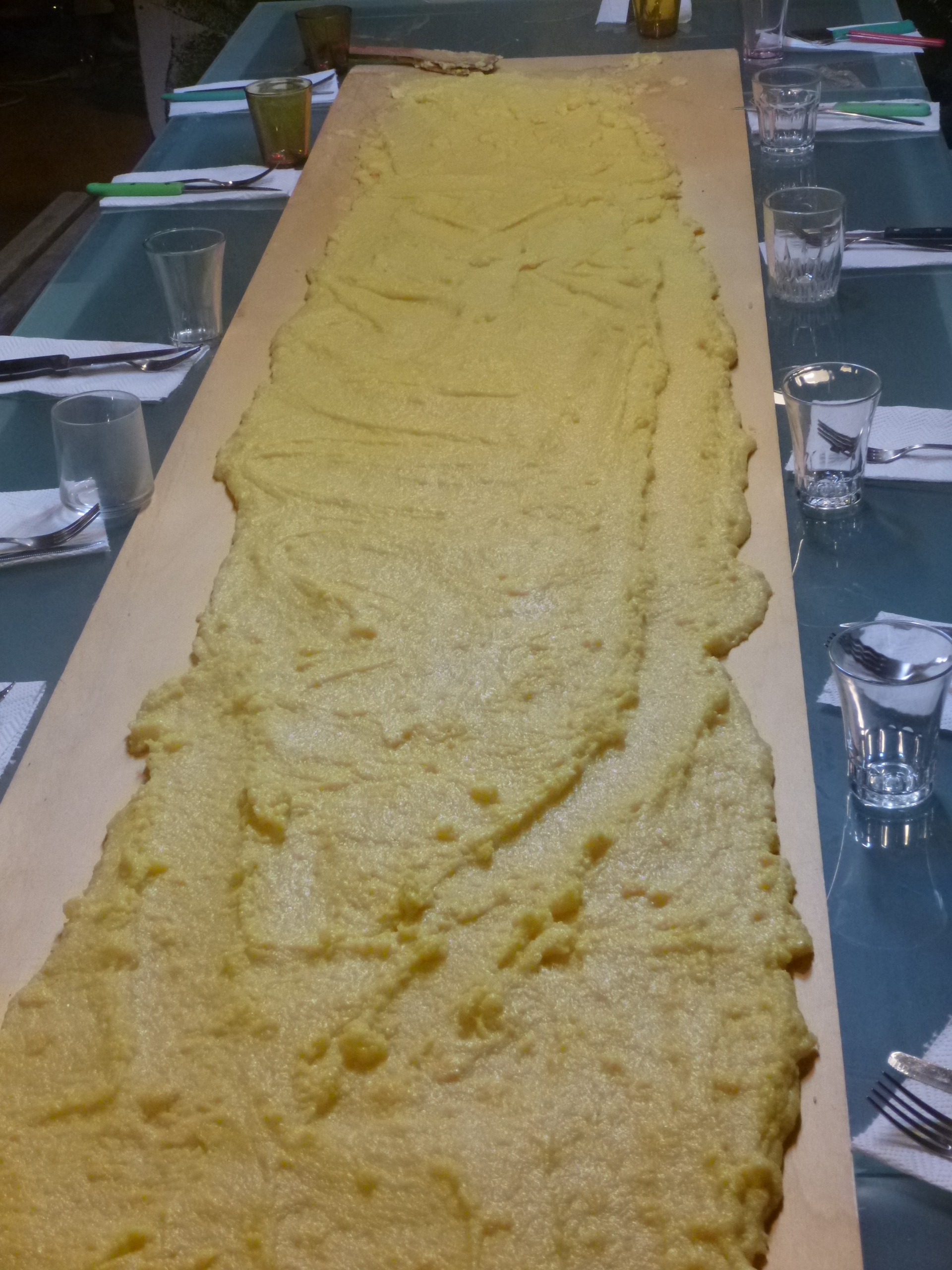 On a Saturday, they laid out a big block of wood on the table, spread polenta on it, then poured tomato sauce, sausage, and other meats on it, then gave everybody a fork, then “Cin cin!” (Cheers). That was the Southern style of polenta, then we had Northern style the next day of mixing it all together and eating like porridge.
