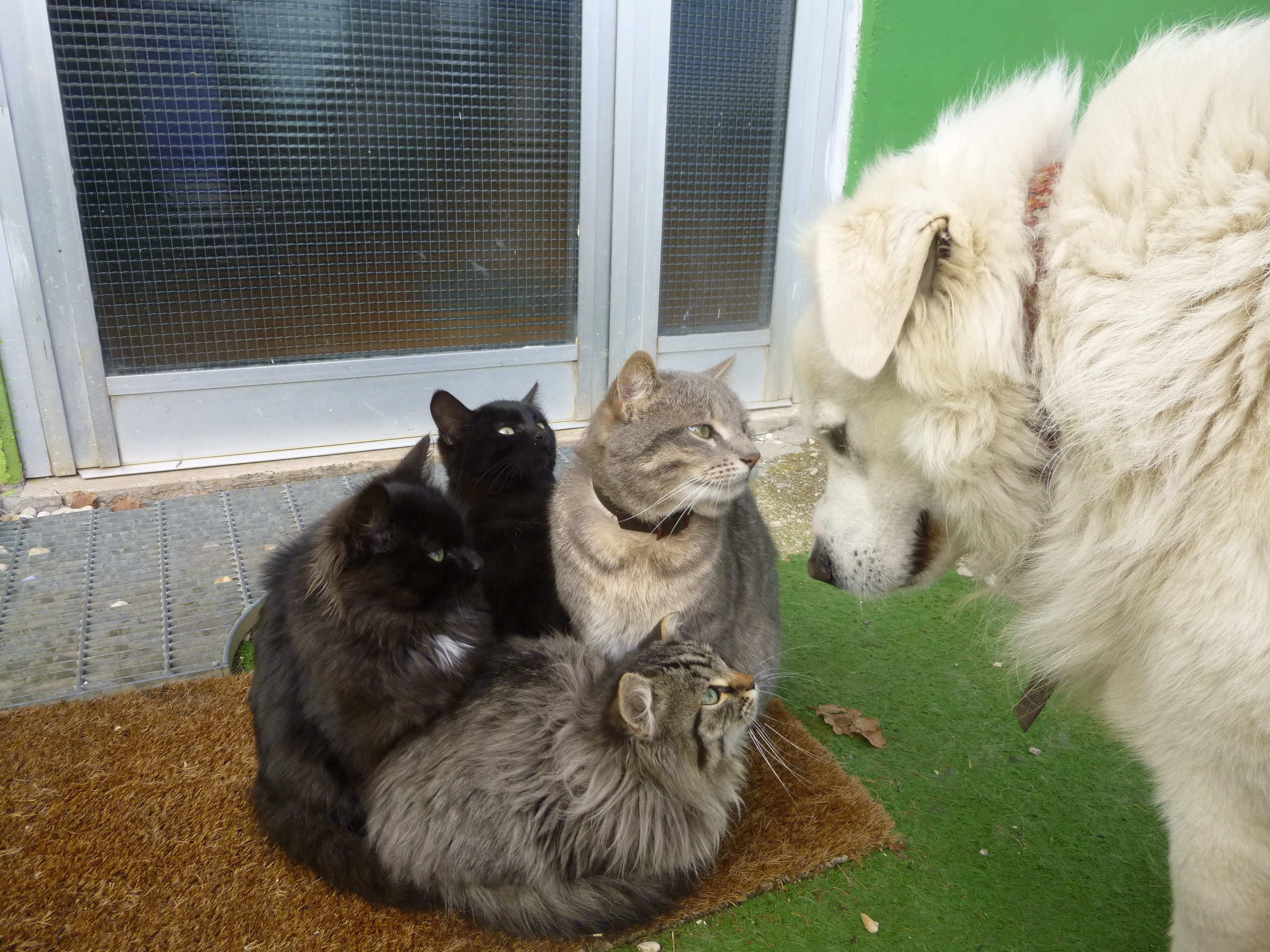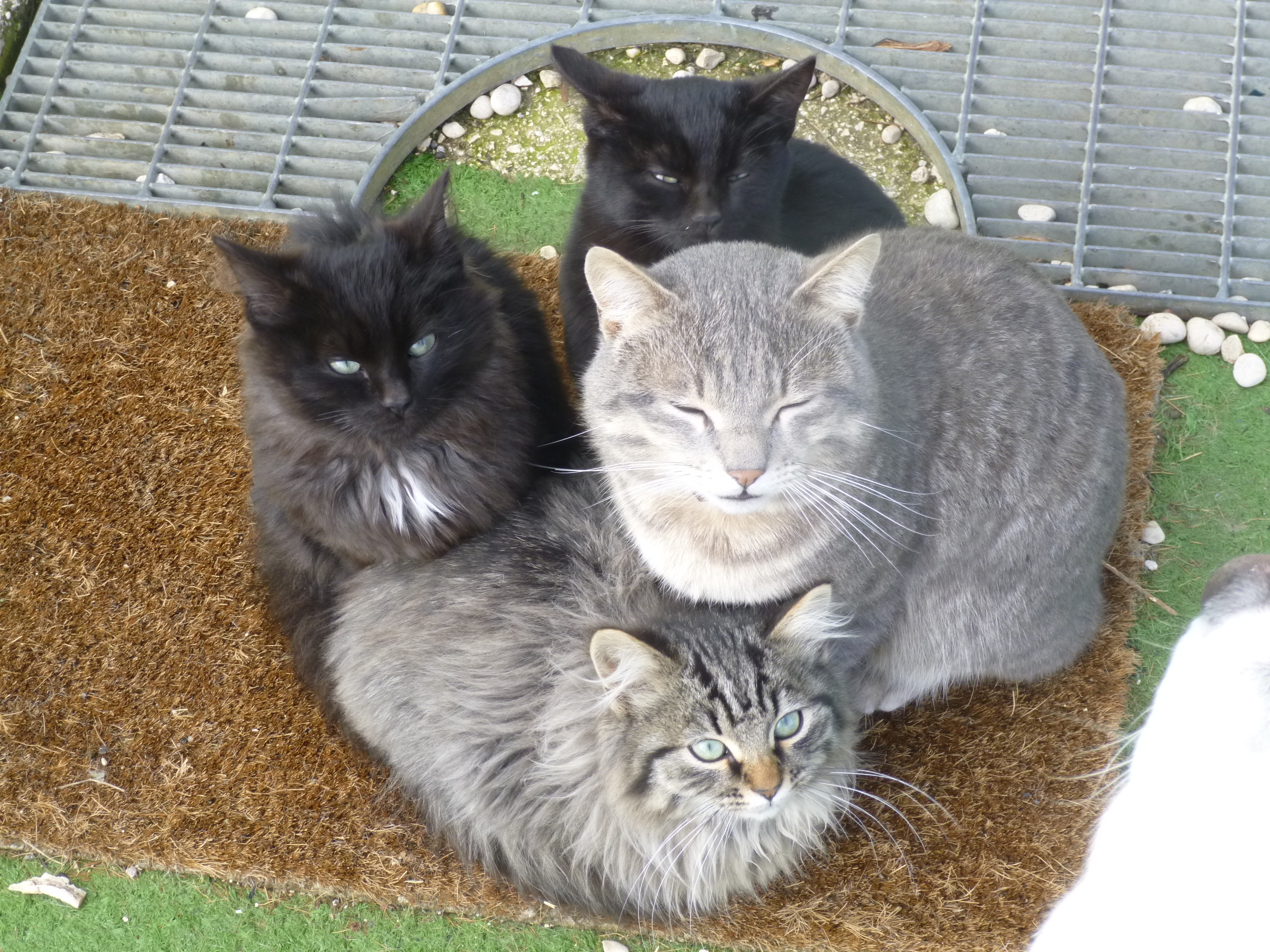 The 6 cats (hard to catch them all at once) gather for warmth most mornings, as they leer at Balu bothering them.