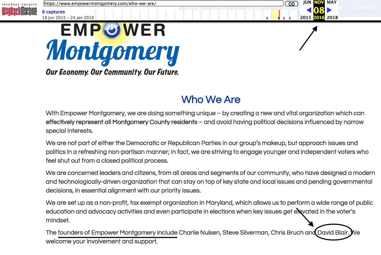 That story, entitled “In Maryland’s largest jurisdiction, contest for county executive seen as anybody’s race,” quoted two “experts,” both of whom – Keith Haller and Steve Silverman – sat on the four-person candidate interview committee for a group called Empower Montgomery. Purporting to “effectively represent all Montgomery County residents – and avoid having political decisions influenced by narrow special interests,” Empower Montgomery actually represents the county’s most powerful special interest group: wealthy developers. Blair has been listed among the organization’s co-founders (Silverman has, too, though neither man currently appears on the Empower Montgomery website) and Elrich was the only county executive candidate who refused to take developers’ campaign contributions, insisting he would hold them accountable for paying for the school construction and transportation infrastructure necessary to support new development. So it wasn’t too surprising when Empower Montgomery launched a series of attack mailers against Elrich right before the election.