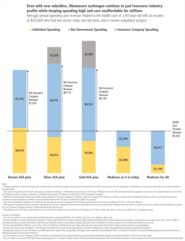 The graph below addresses all of these problems. It shows health care spending and revenues for a 60-year-old individual making $30,000 who requires some medical care during the year – two doctors’ visits beyond the physical Obamacare covers, two lab tests, and a routine surgery, the combined price of which can be estimated at $5,583 – under five different coverage scenarios. The first three scenarios are coverage under an average Bronze, Silver, or Gold plan that this individual would have access to today (with the enhancements in the ARP that the AFP seeks to make permanent factored in). The fourth scenario is coverage under the Medicare program, which 17 senators and 156 House Democrats recently asked Biden to improve and extend to individuals below age 60. While Biden and Democratic leadership have yet to indicate they will actually do that, the White House does claim in both their AFP Fact Sheet and budget writeup that, in the words of the budget document, Biden “supports…giving people age 60 and older the option to enroll in the Medicare program.”
